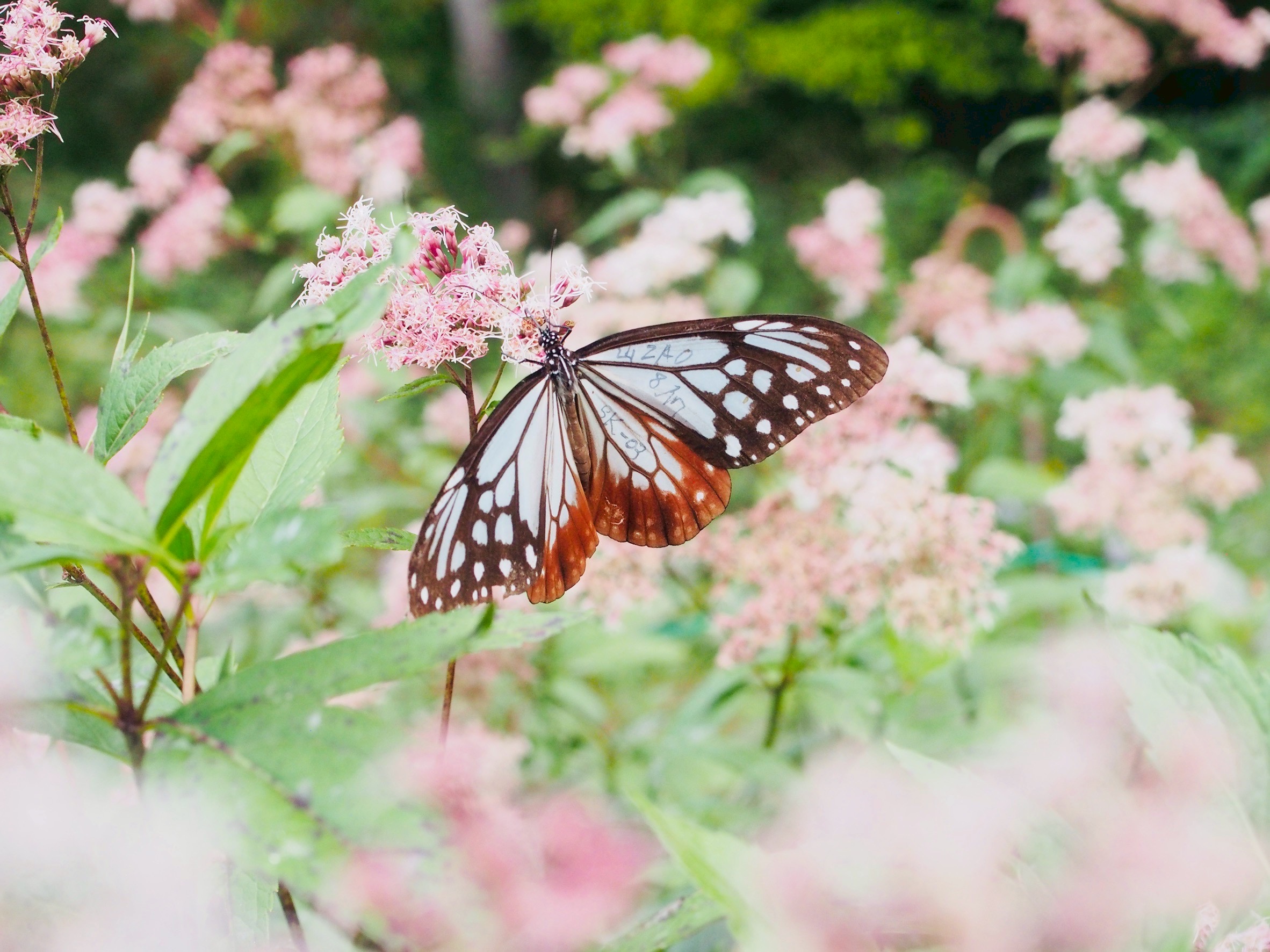I was recently visiting Japan from Australia with my wife and went with a local, whom we had known from Australia, to the Kobe Nunobiki Herb Gardens. This butterfly caught my eye but I was very surprised to find hand written markings on its wing. I knew nothing of this practice but guessed it was about tracking. I was pointed to this web site by a young Japanese photographer I met in Kyoto and would love to know who, where and how the markings were done/ KN, 10.13 , XX133 . Translation : 私は最近妻と一緒にオーストラリアから日本を訪れており、オーストラリア出身の知り合いの地元の人と一緒に神戸布引ハーブ園に行きました。 この蝶が目に留まりましたが、羽に手書きの模様があったことにとても驚きました。 私はこの行為について何も知りませんでしたが、追跡に関するものだと推測していました。 私は京都で出会った若い日本人写真家からこのウェブサイトを教えられ、誰が、どこで、どのようにマーキングが行われたのか知りたいと思っていました/ KN, 10.13 , XX133 。 [返信]